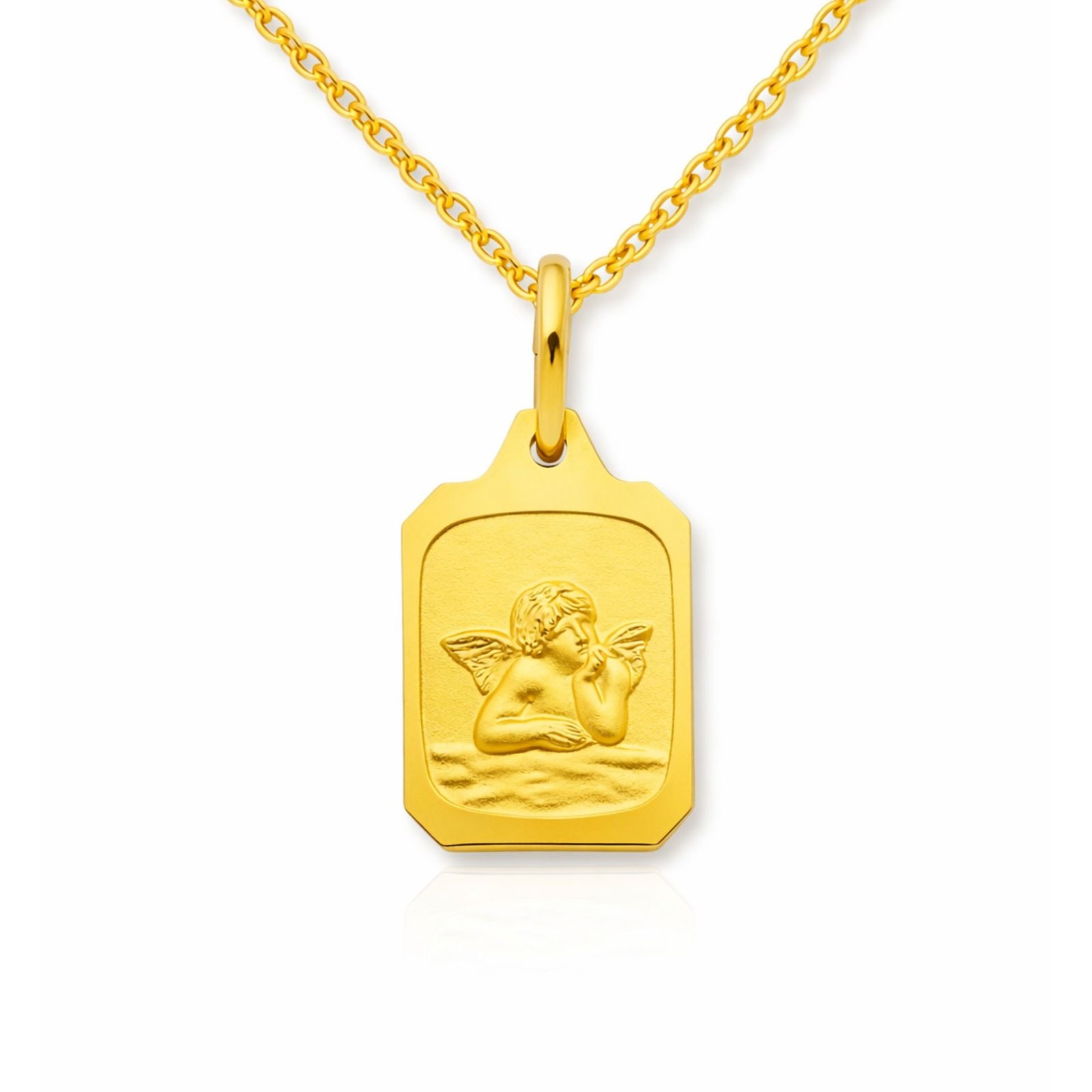Mit seiner rechteckigen Form und der Größe von ca. 8 x 10 mm wirkt der Anhänger dezent und dennoch sehr ausdrucksstark. Der warme Glanz des Gelbgolds macht ihn zu einem zeitlosen Schmuckstück, das besonders als Geschenk zur Geburt, Taufe oder Kommunion von Herzen kommt.