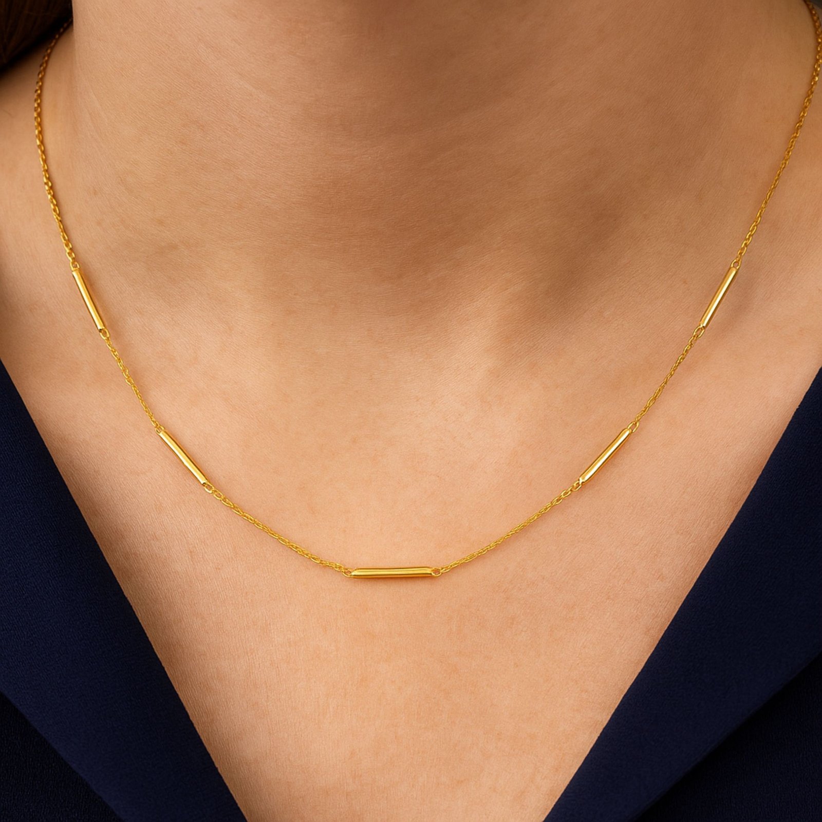 In gleichmäßigen Abständen sind kleine, feine Stäbe in die Kette integriert, die dem Schmuckstück eine dezente Struktur und einen modernen Akzent verleihen.