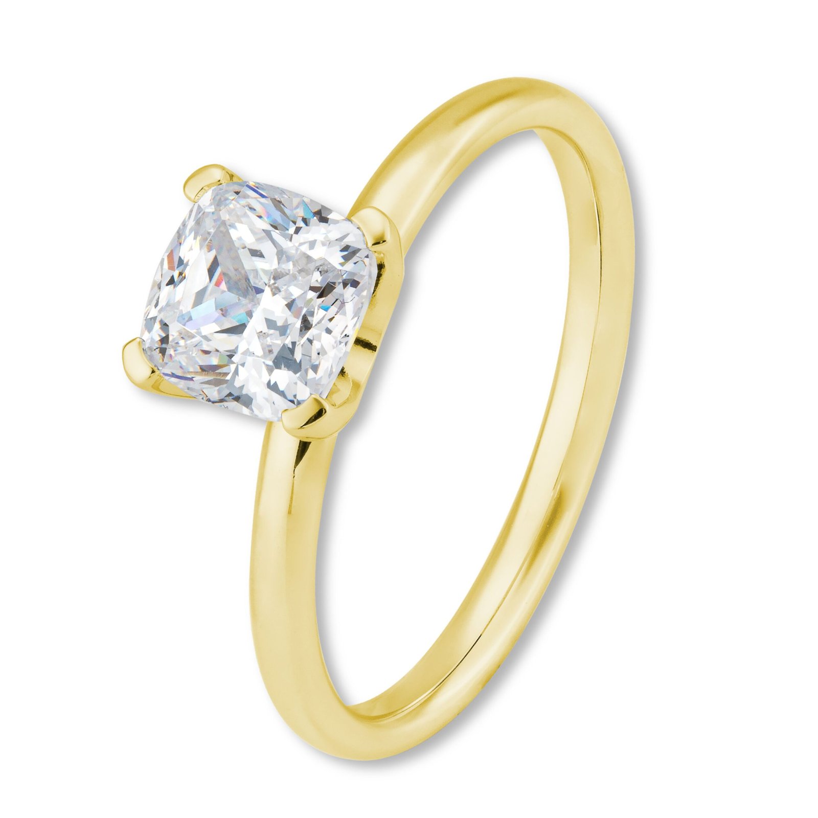 Im Mittelpunkt steht ein atemberaubender Diamant mit 1,50 Karat, kunstvoll im Cushionschliff gestaltet.