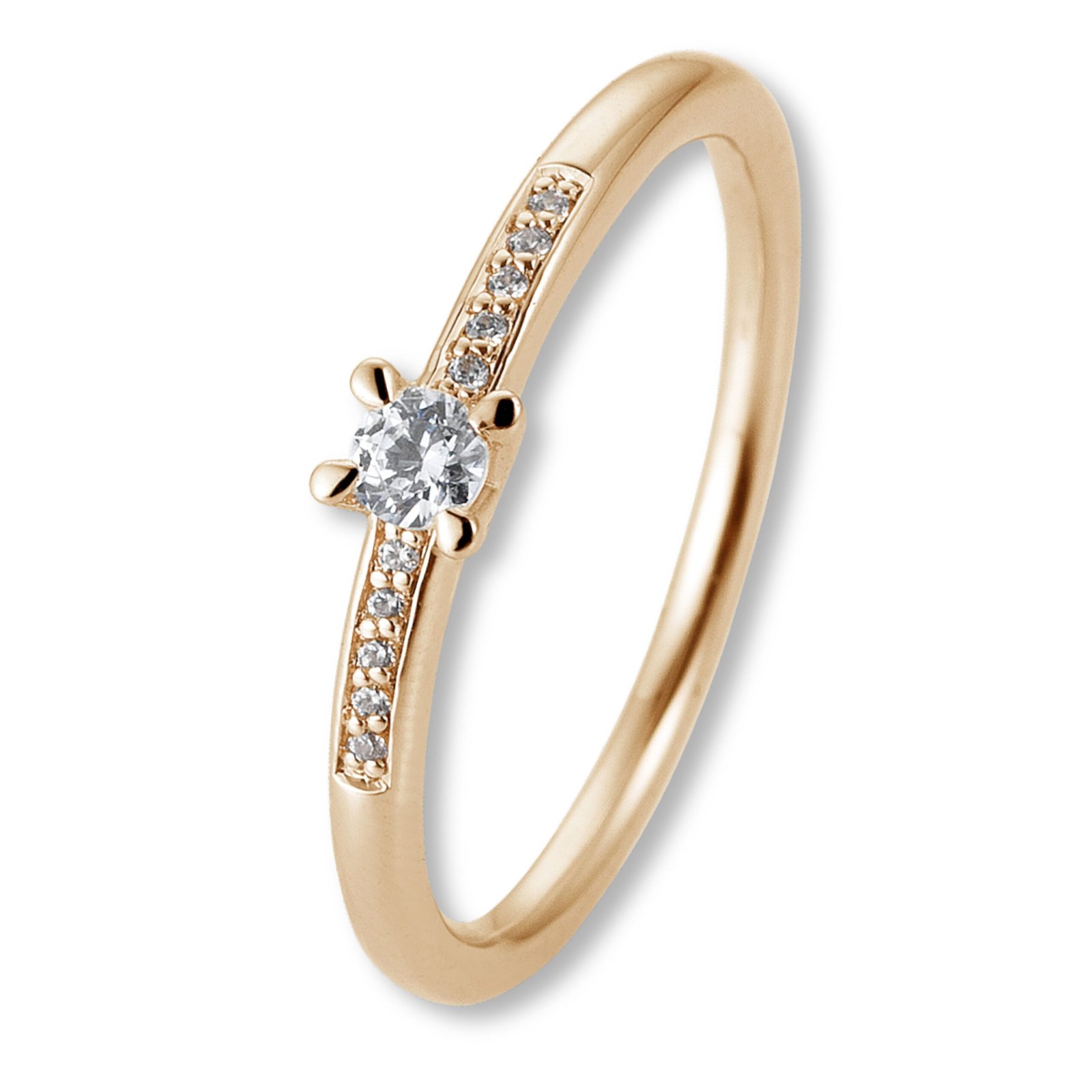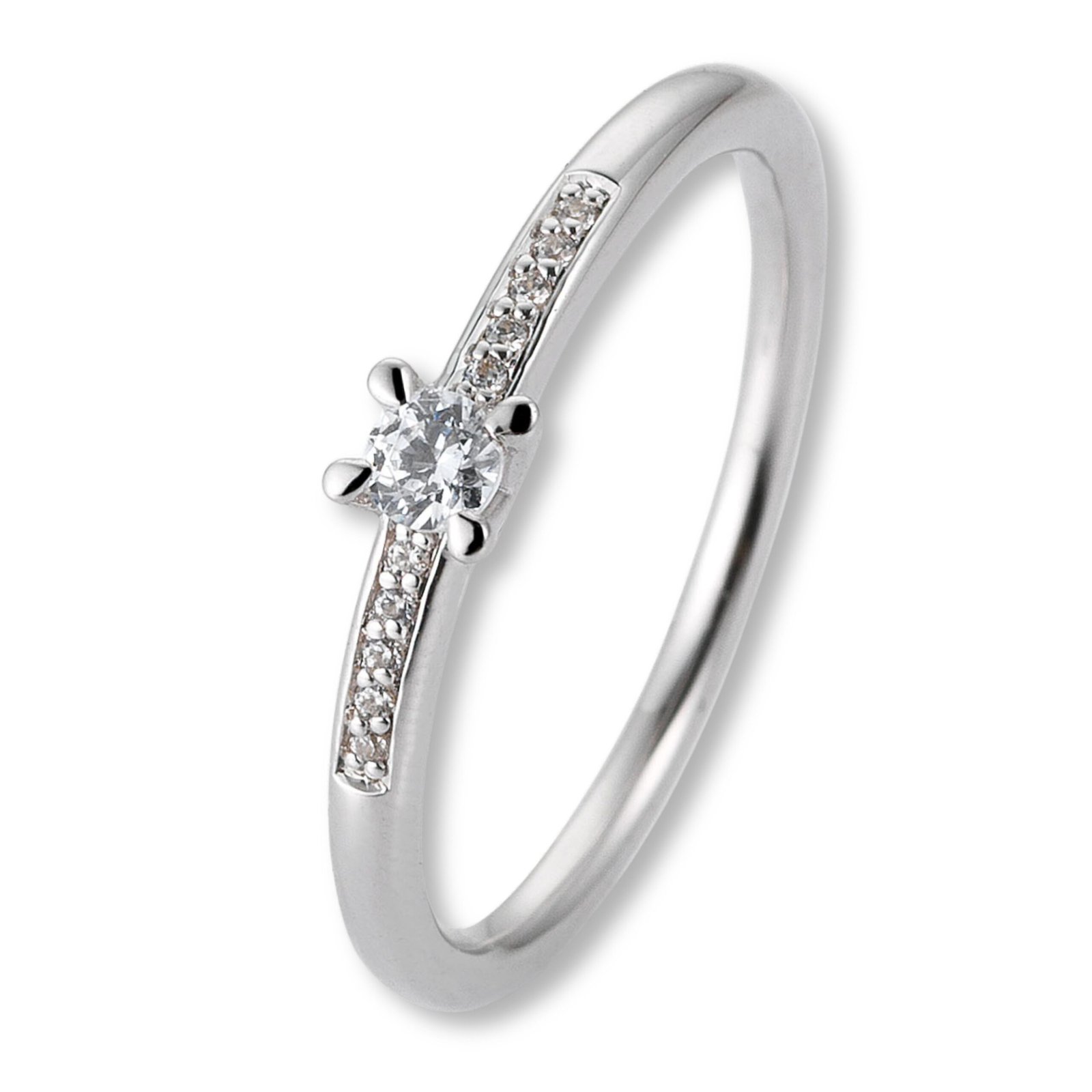 Zu einem besonderen Hingucker wird dieser Verlobungsring durch seine Diamanten im Brillantschliff! Der größere Mittelstein mit 0,10ct ist