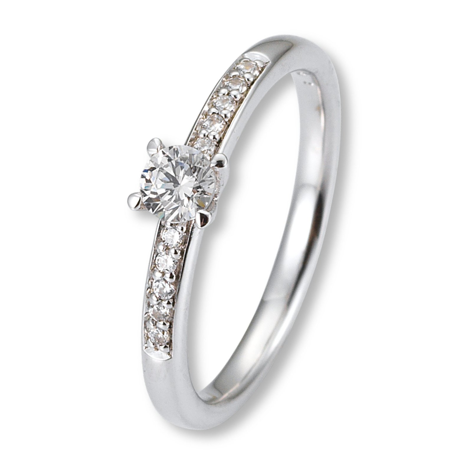 Zu einem besonderen Hingucker wird dieser Verlobungsring durch seine Diamanten im Brillantschliff! Der größere Mittelstein ist